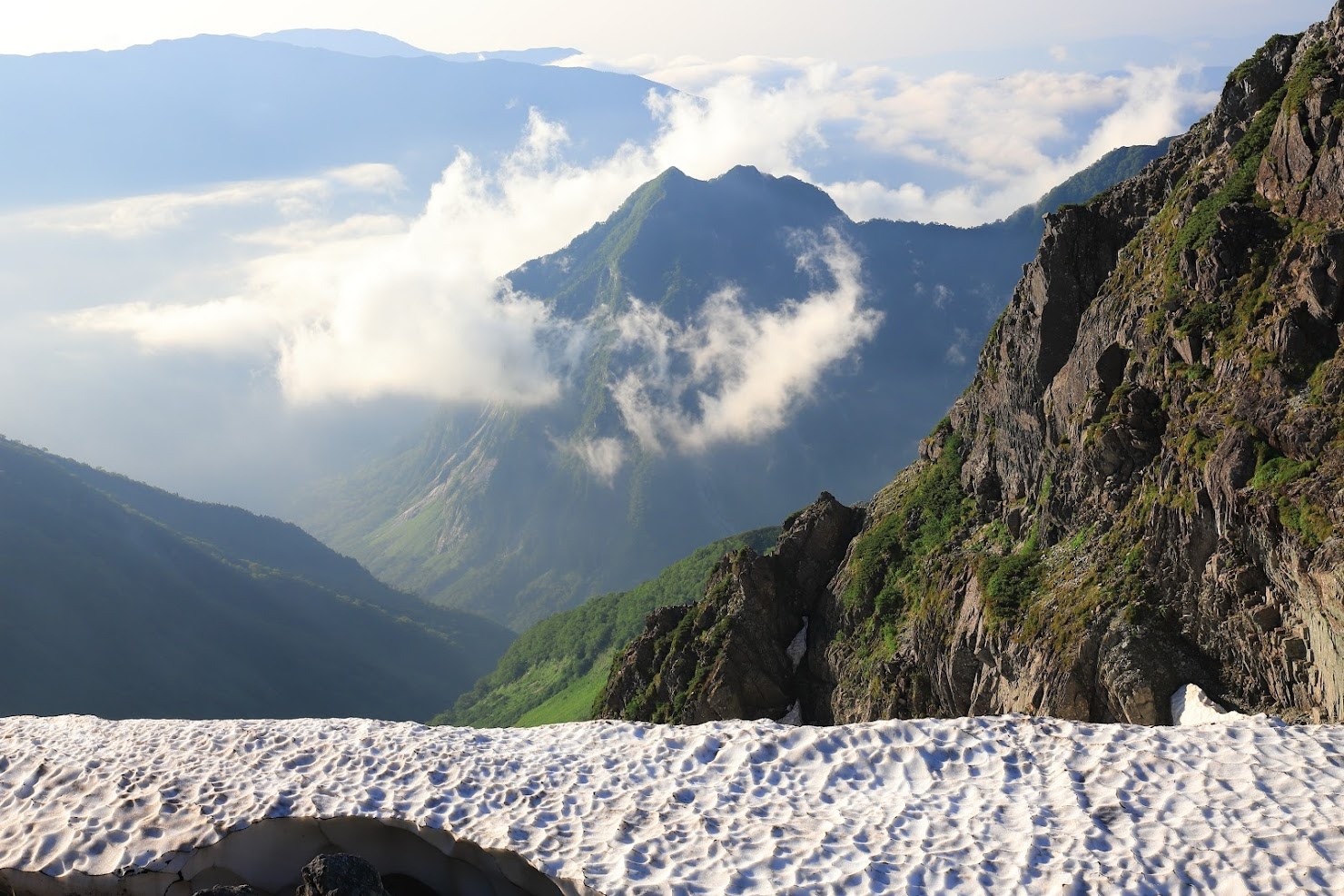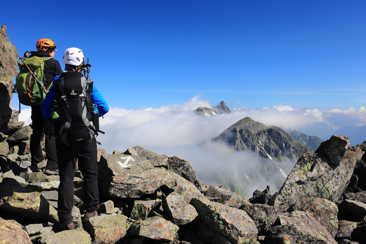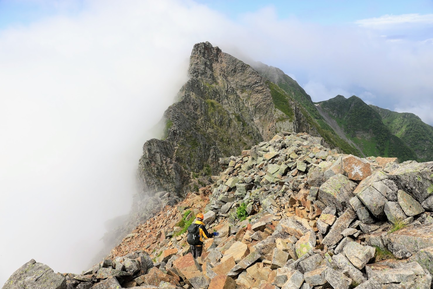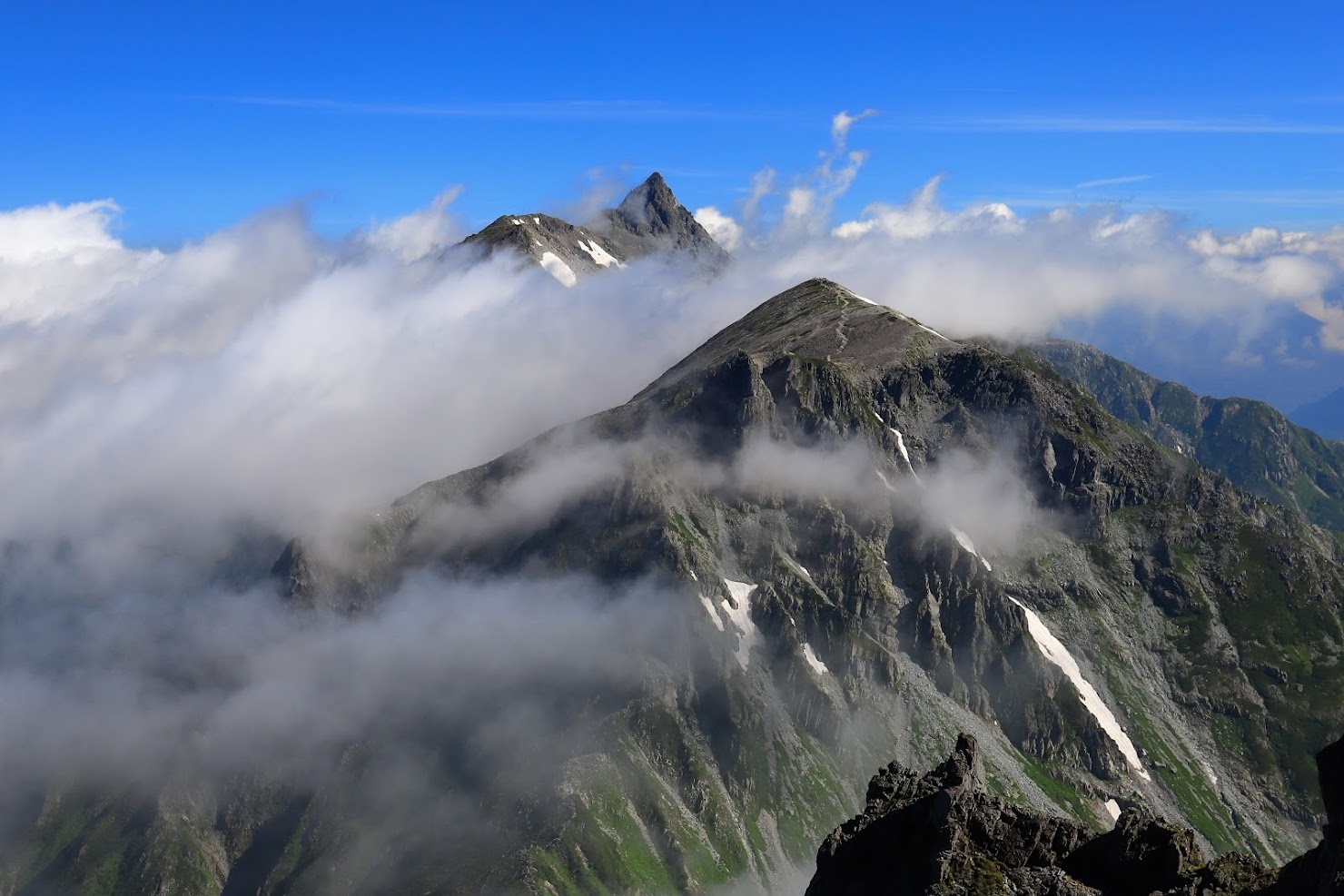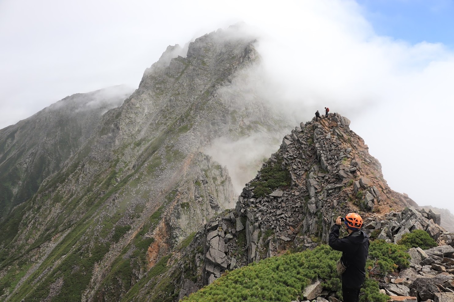 於是,這5天4夜的槍、穗高連峰非常完美,雖然第二天的西穗高岳到穗高岳天氣較差,幾乎走在雲霧中而看不到驚心動魄的危崖峭壁,但因為颱風帶來的水氣較豐沛,於是第三天走在北穗高岳、南岳,我們看見了雲霧中的槍岳,還有霧開雲散的飛驒哭泣、長谷川峰、大切戶、南岳等藍天白雲之美景。