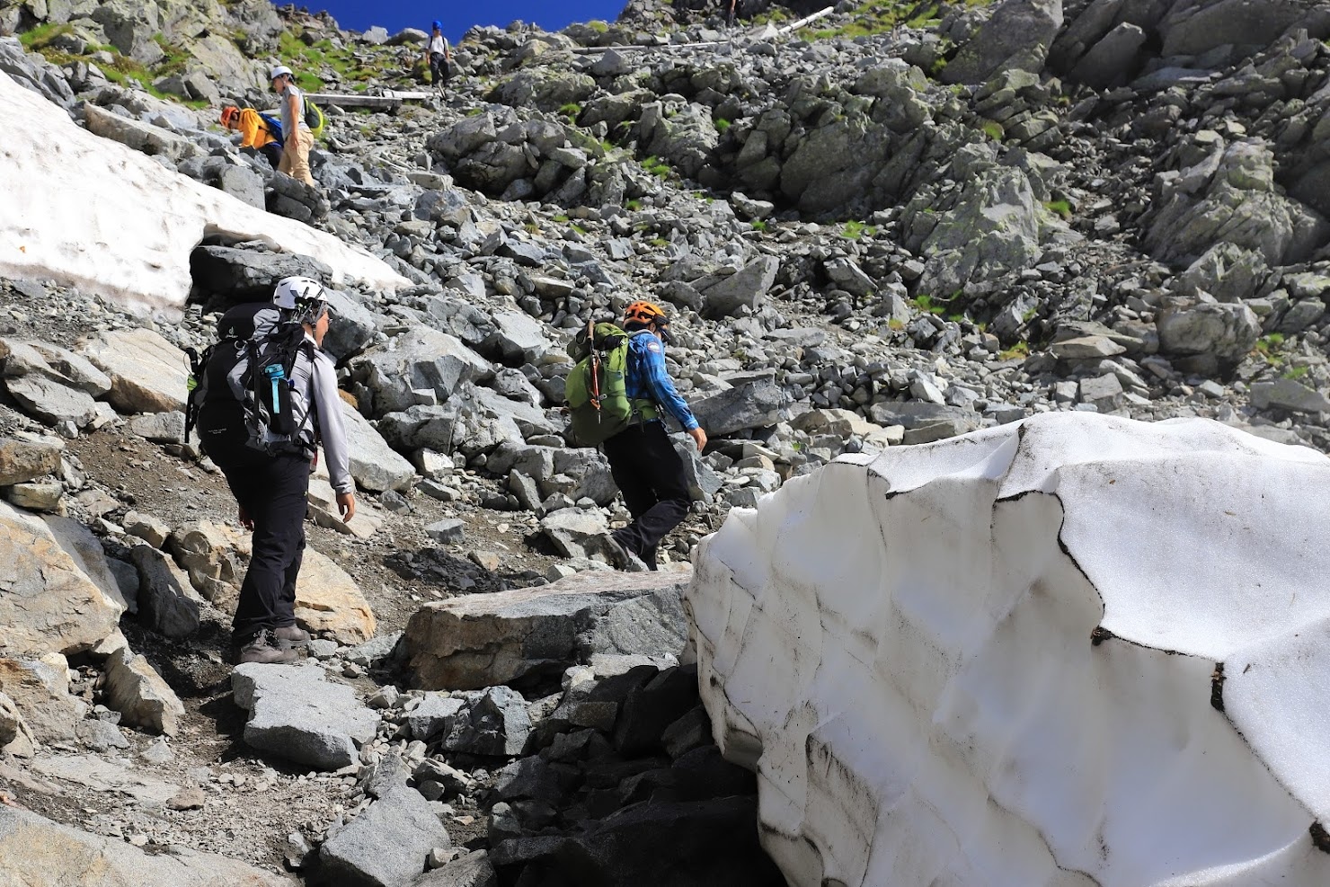 接下來仍是陡上又陡下,有幾處的白漆OX標示不明顯,我們花了一些時間尋找正確路線,途中在岳沢小屋叉路口休息、吃午餐。