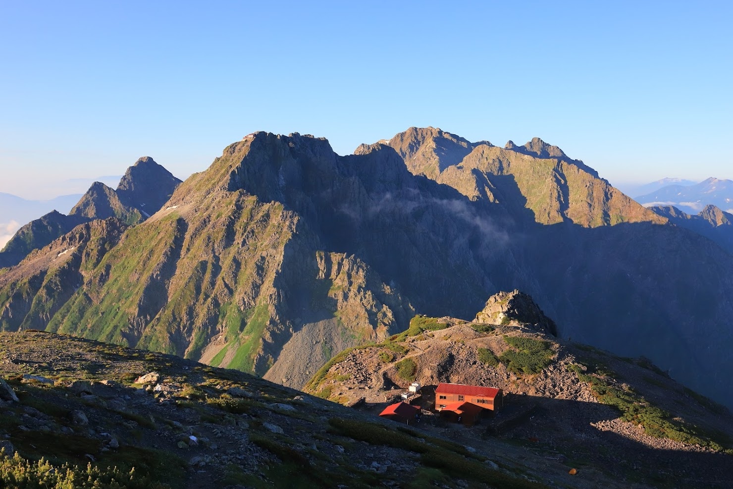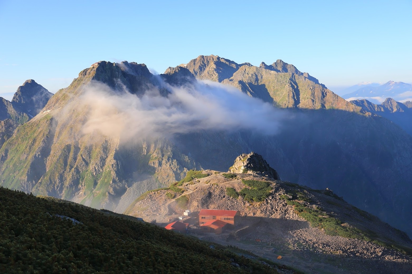 從大喰岳遠眺槍岳與山下的槍岳山莊。